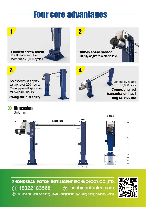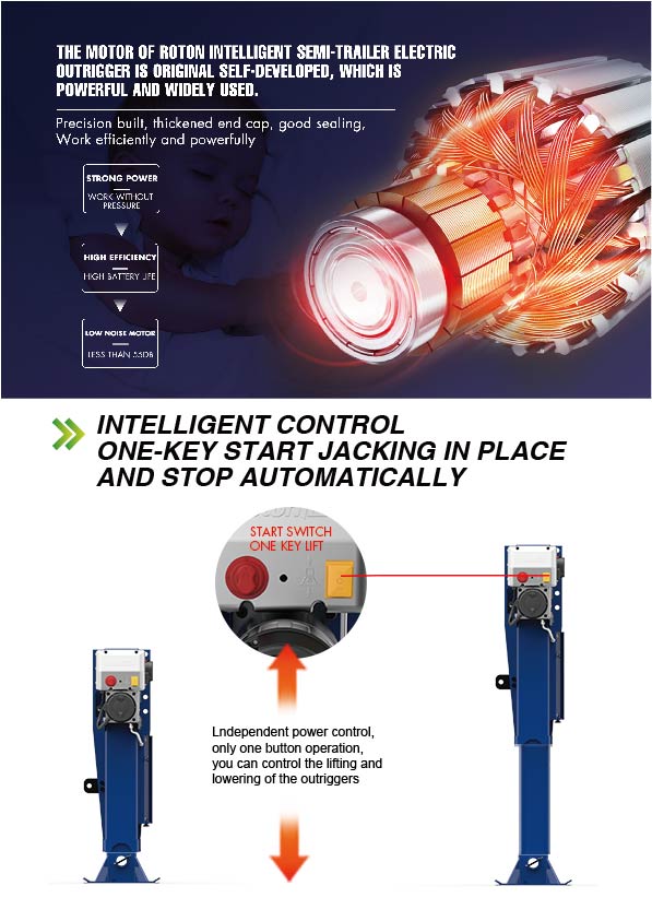 The Rotontek 20T Electric Landing Gear is engineered for semi-trailer support, enhancing efficiency with dual outriggers that lift simultaneously. Its advanced transmission incorporates a ball screw mechanism, offering greater energy efficiency than conventional systems. The built-in screw anti-return function ensures stable operation and load security for semi trailer landing legs, while the intuitive one-button control simplifies use of the electric powered jack. This design makes the Rotontek system a reliable choice for trailer support jack applications across diverse working conditions.
