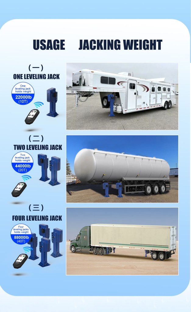 Load Capacity: Single jack supports 10 tons, two jacks 20 tons, four jacks up to 40 tons, offering a robust truck trailer jacks solution.